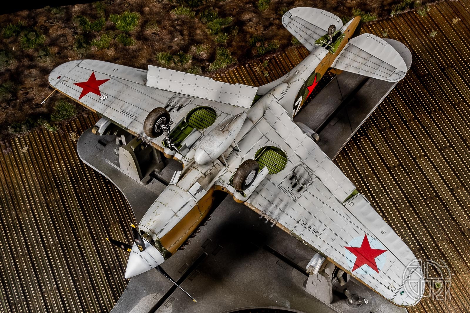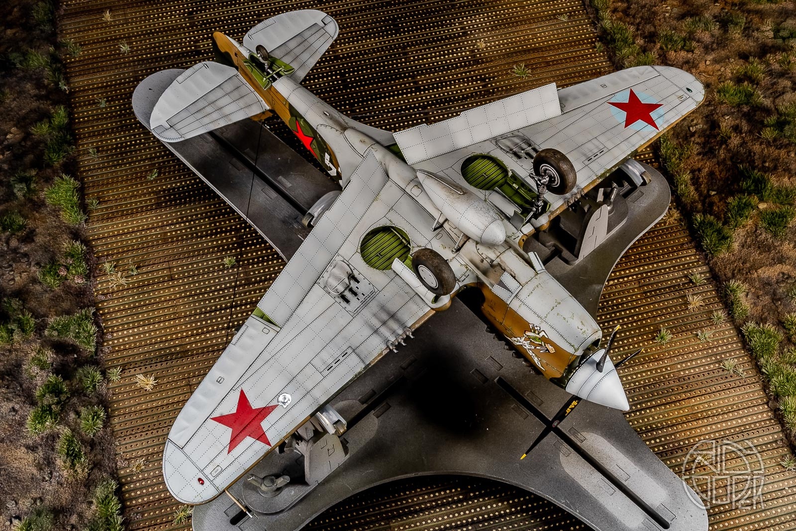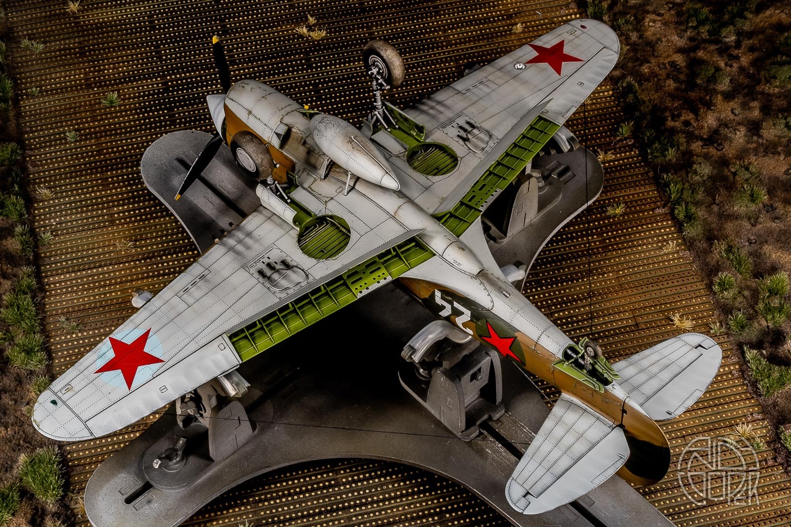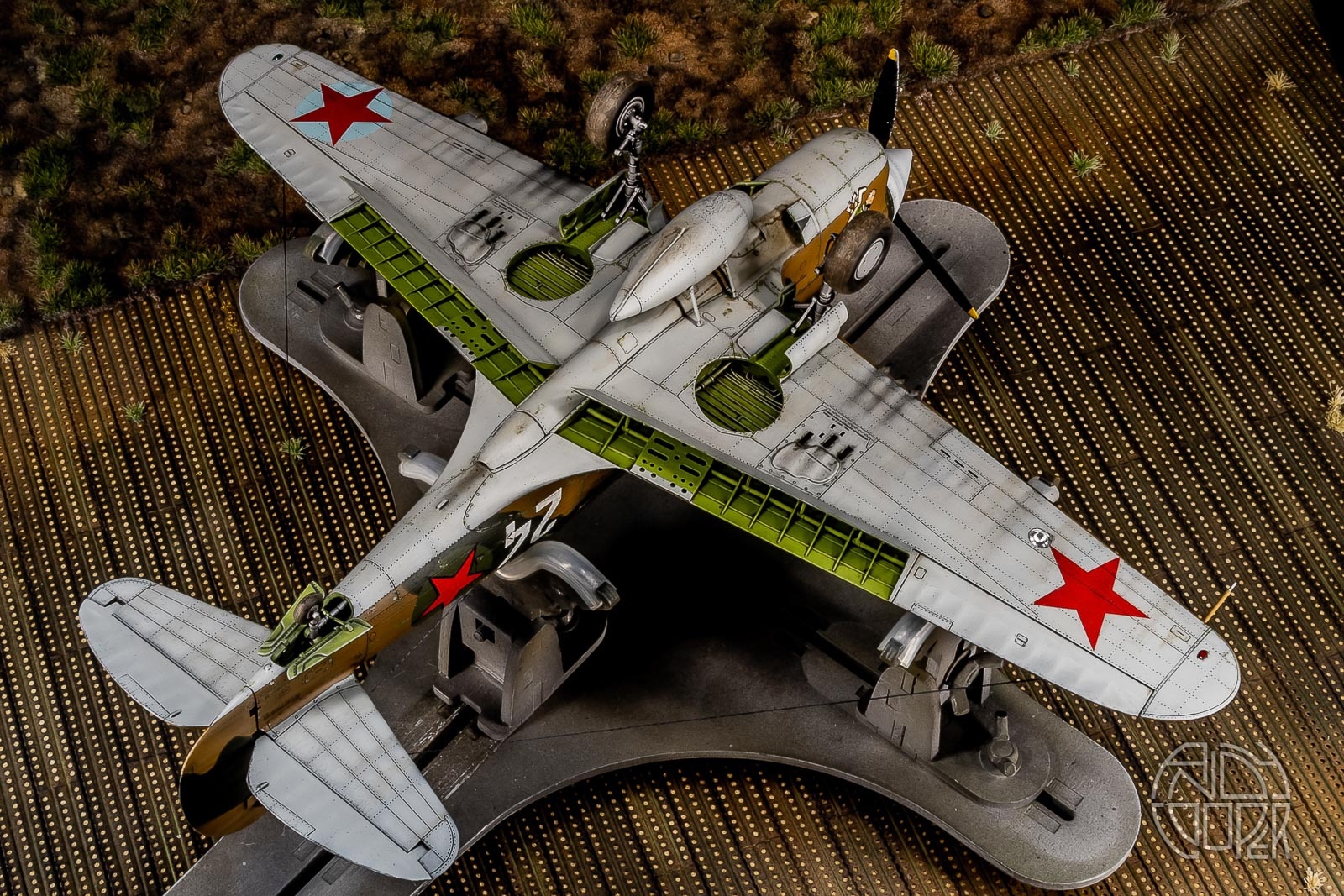 Когда только начал собирать эту модель попутно сделал основание на вращающейся основе – полевой аэродром на базе фототравлёных панелей от Микродизайна, на которой эта модель сейчас и красуется. Размер аэродрома – 60х60см. Основание – пенопласт толщиной 5см.