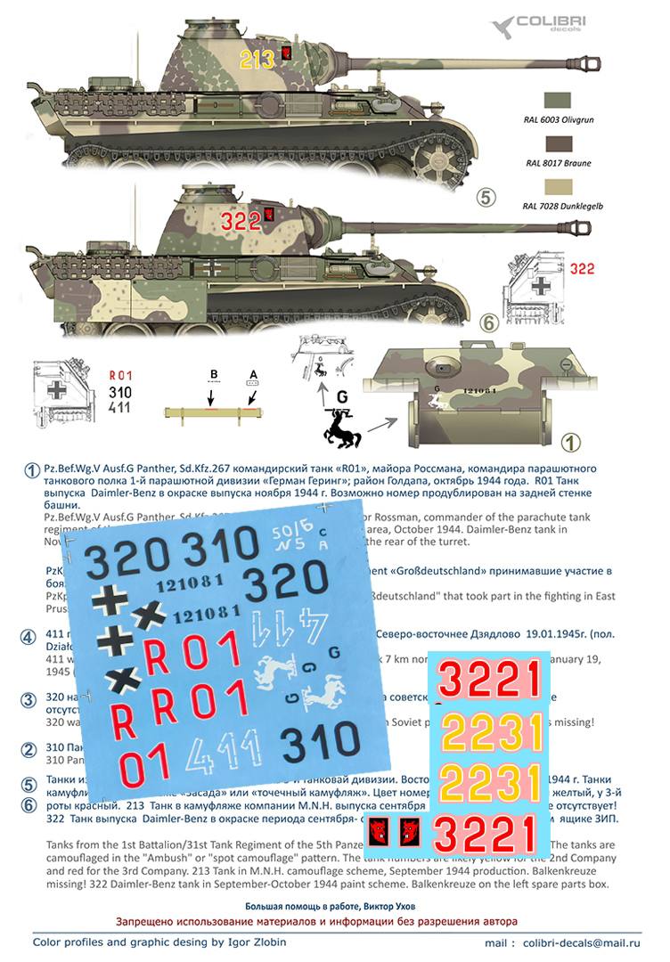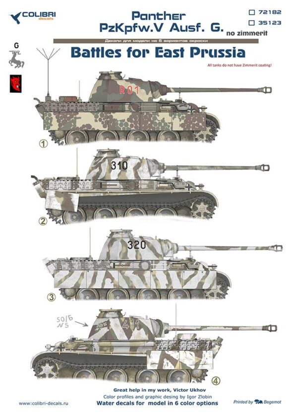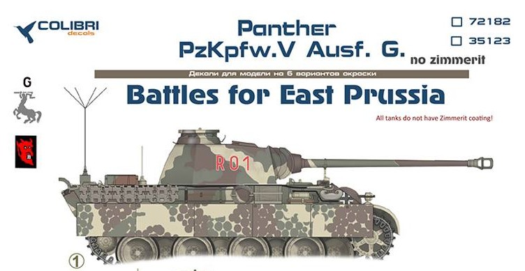Российская Colibri Decals выпустила новые декали для модели безциммеритной Пантеры поздних выпусков на зиму 1945 года. 13 января 1945 года началась Восточно-Прусская стратегическая наступательная операция. В ходе операции советские войска прорвали немецкую оборону, вышли к Балтийскому морю и ликвидировали основные силы противника, заняв Восточную Пруссию и освободив северную часть Польши. Противостоять крупнейшему советскому наступлению противник пытался контрударами танковых соединений вооруженных танками Пантера последний серий G.